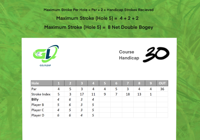 For those of you who haven’t had your handicap yet, it’s your lucky day because you’re allowed to take a maximum of 5 shots over par on each hole. That’s it, no fancy formulas!